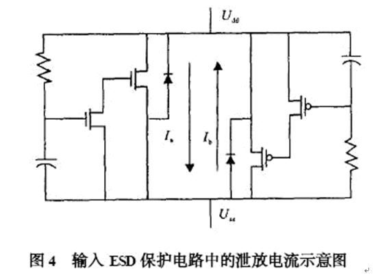 該保護電路在NS 模式下通過M9 釋放ESD 電流,在PD 模式下通過M8 釋放,均能達到較高的耐壓值(見表1) 。 當放電模式是PS 模式時,利用電源間的保護電路來形成一條新的放電路徑,電流通過ggPMOS(M8 ) 正向偏置的寄生二極管流向Udd ,Udd和GND 之間的電壓升高,M6 和M3 構成的RC 檢測電路,觸發大尺寸的MOS 管(M2 , M0 ) 迅速導通,在Udd 和GND 之間形成通路, 有效放電。 由于ggPMOS 的寄生二極管處于正向偏置,Udd 和GND之間瀉流管尺寸很大,所以電路可以承受很大的電壓。 在ND 模式下原理類似,即通過ggNMOS ( M9 )正向偏置的寄生二極管,以及中間的鉗位電路瀉放ESD 電流。 圖4 是上述Udd到Uss片上保護電路原理的示意圖。