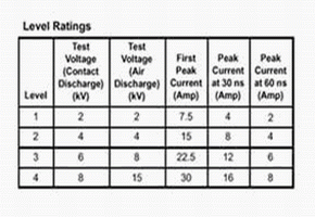 以系統級的方法來定義典型的ESD事件所采用的最常見的波形,是以其亞納秒上升時間和高電流電平(參見圖1)為顯著特征的IEC61000-4-2波形。這種波形的規范要求采用四級ESD量級。大部分設計工程師都要求把產品限定到最高級的8kV的接觸放電或15kV的空氣放電。當進行元器件級測試時,因為空氣放電測試在這樣的小型元器件上是不能重復的,接觸放電測試則是最適合的測試方式。
