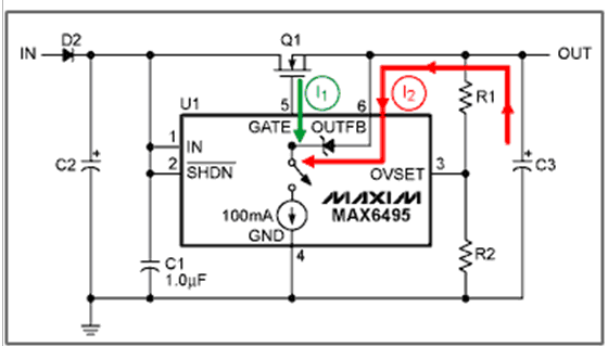 MAX6495–MAX6499/MAX6397/MAX6398通過內(nèi)部100mA的電流源(見圖4)連接到GATE輸出,以對(duì)柵極電容和輸出電容放電。電流源先對(duì)GATE放電(電流I1,綠色箭頭),直到GATE的電壓等于OUTFB電壓,然后斷開FET,電流源繼續(xù)降低GATE電壓,最后,直到內(nèi)部的箝位二極管變?yōu)檎蚱茫瑢?duì)輸出電容放電(電流I2,紅色箭頭)。