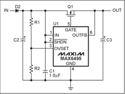 過壓保護(hù)(OVP)器件數(shù)據(jù)資料中提供的典型電路可以滿足大多數(shù)應(yīng)用的需求(圖1)。然而,有些應(yīng)用需要對(duì)基本電路進(jìn)行適當(dāng)修改。本文討論了兩種類似應(yīng)用:增大電路的最大輸入電壓,在過壓情況發(fā)生時(shí)利用輸出電容存儲(chǔ)能量。