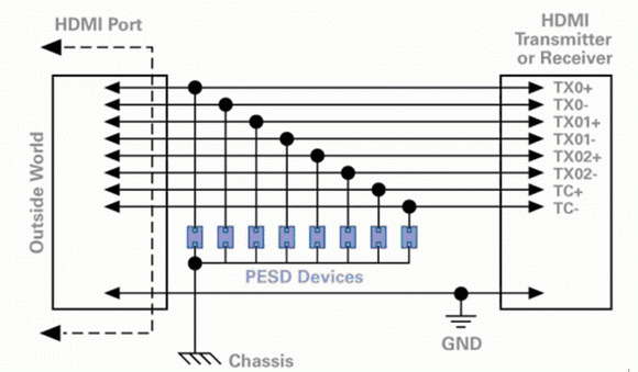 F2:帶PESD器件的典型HDMI電路示意圖(基于HDMI規范1.2)