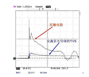 圖3: TVS元件與壓敏電阻在8kV IEC 61000-4-2應力沖擊測試下的輸出波形對比