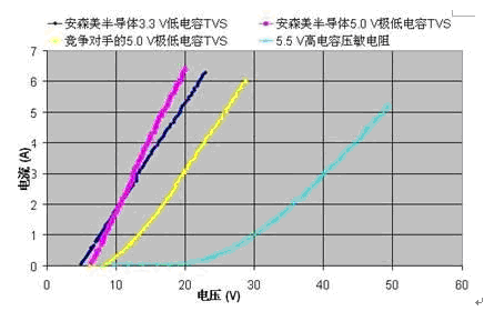 結合ESD脈沖測試和TLP測試,我們可以得出結論,在不同ESD保護元件中,TVS元件,特別是安森美半導體的TVS元件的大電流導電率極佳,且在重復應力條件下仍能維持優異性能,不存在壓敏電阻或聚合物那樣的使用增多后會出現性能下降的問題;至于其在電容方面的不足,也隨著新的低電容設計的出現,而消除了早前的大電容問題。