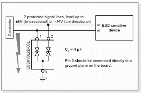 如圖4所示,USB2.0傳輸鏈路的差分數據線應連接至ESD8V0L2B-03L的管腳1和管腳2上。二極管的管腳3接地。由每個二極管產生的線路電容都是4pF,差分線間的電容為2pF。