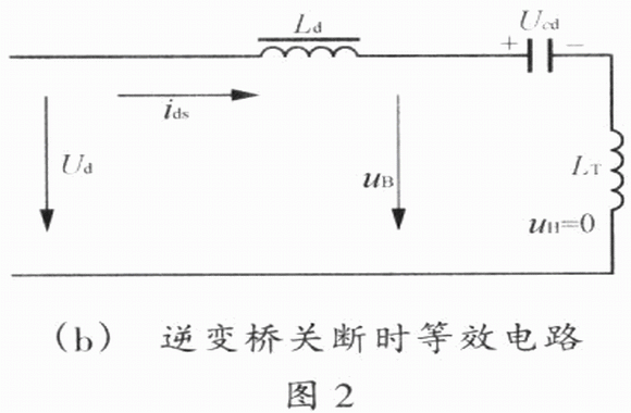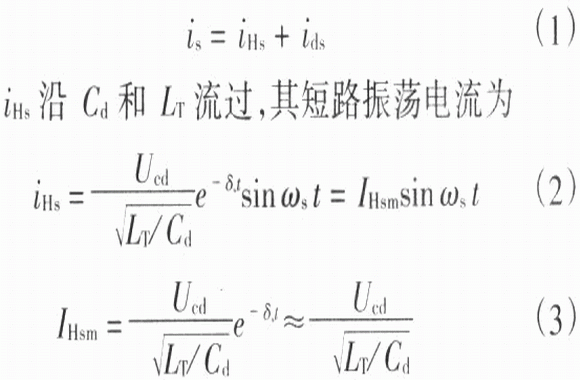 在負載短路時,逆變橋囚侵入干擾信號而產生直通短路,逆變橋輸入電壓突降為零。這時,原來儲藏在濾波電感Ld中的磁能和隔直電容Cd中的電能均分別以短路電流ids和iHs的形式向逆變電路釋放,等效電路圖為圖2(a)所示。橋中IGBT流過的短路電流is為
