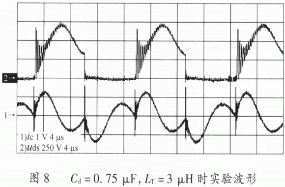 結合前面的分析,做了相關的實驗,其波形如圖8所示。該實驗中IGBT的工作頻率是50kHz,負載輸出頻率為100kHz。