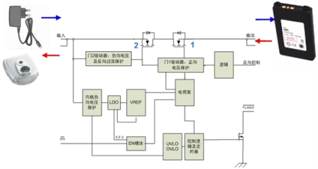 我們把普通墻式適配器或USB充電適配器到移動設備電池的通道稱為直接充電通道,而把移動設備電池到外部附件(如調頻收發器、負載揚聲器和閃光模塊)的通道稱為反向供電/充電通道(參見圖1移動設備的直接充電通道和反向供電/充電通道示意圖)。