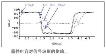 傳輸速率為12Mbps時,其保持電平的時間要長得多(80ns)。在此數據傳輸率條件下,1OpF或更小的電容值將使得數據通過時的失真最小。當傳輸速率提高到480Mbps時,信號具有短得多的電平保持時間(2.0ns)。此時1OpF電容的ESD抑制器件已經引起波形失真:它減少了電平保持時間并使前沿和后沿的形狀大為改變。而660pF電容的ESD抑制器件則造成了相當大的失真,以致于波形甚至無法達到信號工作電壓。圖1顯示了不同ESD抑制器件對480Mbps數據波形的影響。