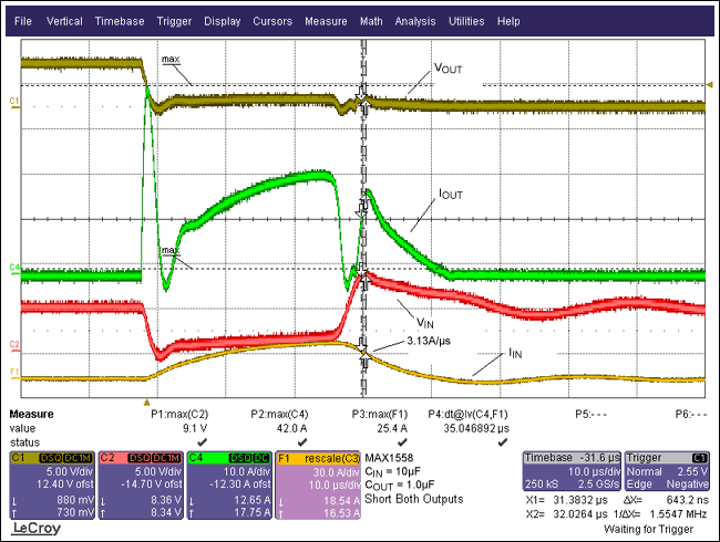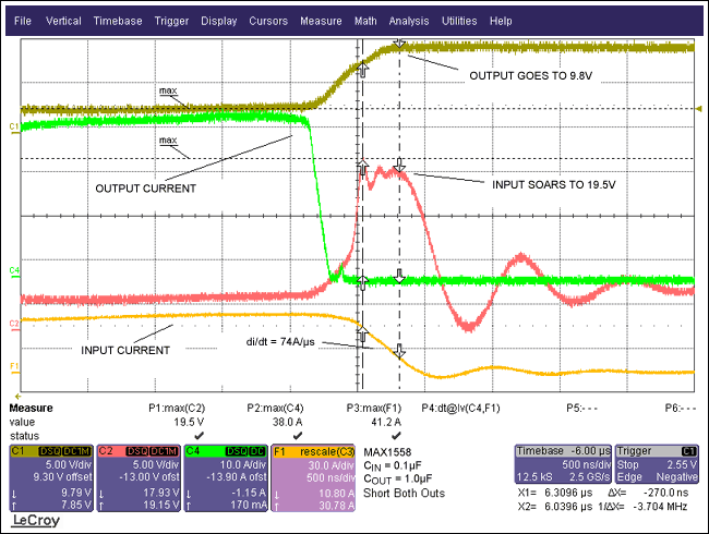 圖2.波形顯示了具有10µFCBYPASS情況下的短路響應,從VIN波形可以看出:由于電流變化使得輸入電壓上沖到了8.6V。