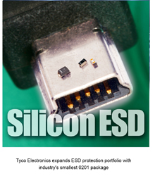 泰科電子今日宣布其防靜電(ESD)保護器件產品線上再添三款新品。其中0201尺寸的硅基ESD(SESD)器件比上一代0402型的器件大約縮小了70%,能夠為手機、MP3播放器、PDA和數碼相機等便攜式電子產品提供保護和提高其可靠性。