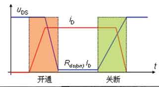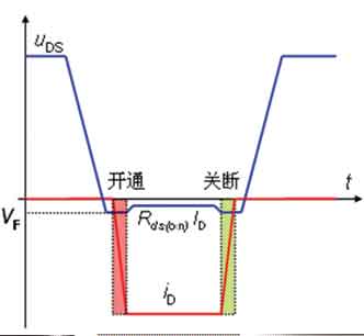 其中,Don為占空比。當(dāng)輸入電壓較高時(shí),占空比就小。因此,對(duì)于高的輸入電壓,而輸出電壓較低,即輸入輸出的電壓差較大時(shí),在一個(gè)開關(guān)周期,上部主功率開關(guān)管導(dǎo)通的時(shí)間將減小,而下部續(xù)流開關(guān)管導(dǎo)通的時(shí)間將自延長(zhǎng)。圖1為上部MOSFET管和下部MOSFET管的工作波形,陰影為產(chǎn)生開關(guān)損耗的部分。