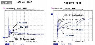 從圖3所示的圖上可見,顯然,與兩個(gè)競(jìng)爭(zhēng)對(duì)手的器件(藍(lán)色波形)相比較,安森美半導(dǎo)體保護(hù)解決方案(黑色波形)可提供更低的ESD脈沖箝位電壓。與KEC的18V和Rohm的23V相比較,安森美的器件將正脈沖箝位在14V。而在負(fù)脈沖期間,這三個(gè)器件之間箝位電壓的差異更加明顯。安森美、競(jìng)爭(zhēng)對(duì)手2和競(jìng)爭(zhēng)對(duì)手1的器件對(duì)負(fù)脈沖的箝位電壓分別是20V、34V和42V。