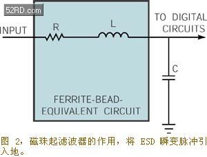 [page]一種可在電路輸入級使用的簡單的ESD瞬變抑制技術,就是將一個磁珠串在輸入引線上,并在輸入引線和地之間接一只容量很小的電容器。圖2示出了磁珠的等效電路。輸入端的LC電路起濾波器的作用,將ESD瞬變的能量分流入地。當使用瞬變抑制二極管保護任何輸入端或輸出端時,要使瞬變抑制器盡量靠近這些端子。很長的導線和電路板印制線都有寄生電感,當ESD瞬變脈沖進入電路時,寄生電感就會產(chǎn)生電壓過沖與振鈴問題。