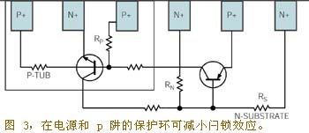 你可使用CMOS布局技術來防止閂鎖效應,因為CMOS布局技術可監(jiān)控ESD瞬變會進入器件的各部位:器件的電源引腳、輸入引腳和輸出引腳。你應降低晶體管(PNP和NPN)的增益,并提高閂鎖效應的閾值,方法是加大器件結構中P溝道Tub與P溝道漏極之間的間隔。在電源和p-tub上連接p+和n+保護環(huán)也可以降低晶體管增益,提高閂鎖效應的閾值(圖3)。防止閂鎖效應的其他工藝技術有:提高阱深度以減少寄生晶體管的增益;采用絕緣襯底(如藍寶石硅)以降低tub和襯底中的電流,;在每個阱下面采用埋層或外延層(圖4)。