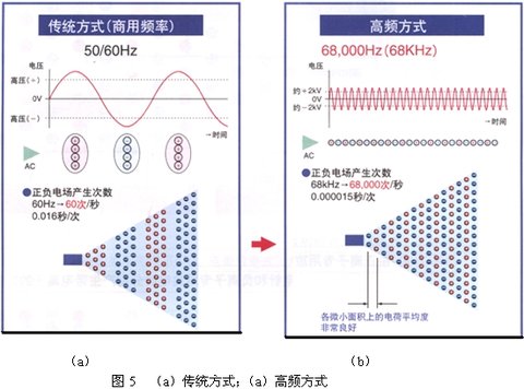 ⑴ 除靜電器有軟X線式、電暈放電式、放射線式與紫外線式等4種。而電暈放電式又分DC方式與AC方式2種。而DC方式含有脈沖DC式;AC方式又分為商用AC,高頻AC及脈沖AC等3種。下邊介紹電暈放電式和離子的產生。