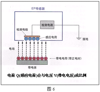 靜電電位傳感器“EP傳感器”主要利用了帶電物體和檢測電極之間的靜電感應現象。帶電物體的電場會致使檢測電極表面產生感應電荷。該感應電荷會被換算成帶電物體的電位并顯示出來。其基本原理見圖6。電荷Q(感應電荷)與電壓V(帶電電壓)成比例。