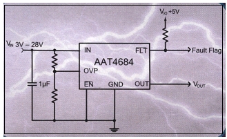用AAT4684—3x2.75mml包裝提供高達28V的過電壓保護。其特征為:最高+28V的過電壓保護;固定或可調節的過電壓保護閾值;3V欠壓鎖定閾值,即快速過電壓保護響應,過電壓瞬變值1μs(最大);低靜態電流,即常用-30μA與關機(禁用)時電流最大為1μA;常用100mΩ(最大為130mΩ)RDS(ON),電壓為4.5V;最大連續電流為1.8A;TSOPJW—12封裝。