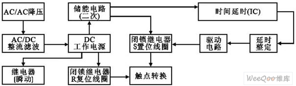 斷電延時繼電器整體構成包括斷電延時繼電器電源部分(經降壓、整流、濾波)以提供斷電延時繼電器內置瞬動電磁繼電器和2繞組閉鎖型R復位線圈工作);二次電源部分(供斷電后延時部分與2繞組閉鎖型S置位線圈工作);延時工作部分(可編程定時集成或CMOS計數分頻集成);驅動部分;執行繼電器部分組成(圖1)。