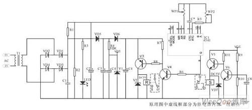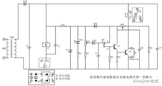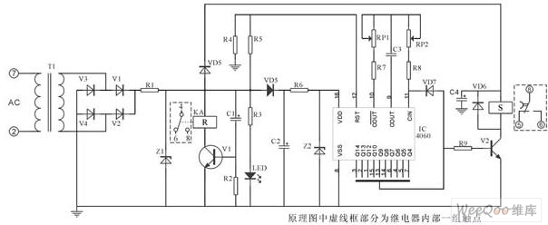 該電路核心部分由IC4541構成,延時設定由RP2、C*設定,A-B端根據需求接相應高、低電平(設定端)內部2繞組閉鎖繼電器采用DC12V(因繼電器工作電壓與IC4060組成延時電器要低,則為保證其驅動則分別由V6、V7、V1、V3構成)。其中C2為二次儲能器件,可根據延時的長短予以調整,C4為完成S置位線圈工作。