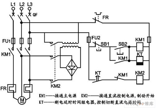 制動過程:按下停止按鈕SB1→KM1斷電,KM1主觸點斷開,電機脫離電源,KM1輔助常閉觸點恢復閉合,KM2通電,接入直流電源,制動開始,同時KM1輔助常開觸點又恢復斷開,則KT線圈呈斷電狀態,延時開始,待所設延時時間到達后,KT的延時斷開常開觸點恢復斷開,KM2失電,切斷直流電源,制動結束。
