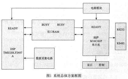 硬件平臺是軟件算法的運行載體,是實現準確、高效選線的保障。本文設計的選線裝置采用雙CPU。即"DSP+單片機"的處理機構。DSP作為運算CPU,負責信號采集、選線計算部分;單片機作為管理CPU,主要負責人機交互部分。DSP處理器由于內部采用哈佛總線結構,指令是流水線操作,以及獨立的硬件乘法器結構等,非常適合進行數字信號處理,進行實時的數據分析和監控。本文采用TI公司的TMS320LF2407A(以下簡稱LF2407A)DSP芯片為數據采集和處理CPU,充分利用其強大的數據處理能力和速度,實現多點數據采集和快速參數計算。單片機采用瑞薩M16C/62P系列單片機,該單片機具有很強的抗干擾能力和1M的尋址空間,適用于事件管理和人機交互。系統總體方案如圖1所示。本保護裝置位于現場,進行數據采集和處理,并且與上位機之間進行通信。保護裝置采用M16C/62P單片機為主CPU,負責系統顯示、控制和與上位機通信;采用TMS320LF2407ADSP為從CPU,負責數據采集和處理;DSP與單片機之間用雙端口RAM進行通信。系統通過RS232和RS485與上位機通信。