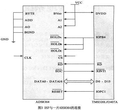 TMS320LF4207A本身雖然自帶A/D轉換器,但其轉換精度只有10位,且轉換速度也不高(500ns)。為了實現更高的速度和精度,選擇了擴展ADS8364芯片。ADS8364是一種高速、低功耗、雙16bA/D轉換器,有6個模擬量輸入通道。可用BVDD獨立供電。它有6個完全相同的采樣保持電路,分成A、B、C3組,每一組都由1個HOLD引腳控制。ADS8364可以從外部引入最大5MHz的時鐘頻率,此時采樣時間是0.8μs,轉換時間只有3.2μs,A/D的最大采樣率達到250K,要達到此值,可在下一次轉換開始時讀取上一次的轉換結果。此A/D完全可以滿足本裝置的采樣要求。AD芯片與DSP的連接如圖3所示。