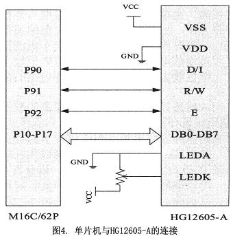 HG12605-A中內藏ST7920點陣式LCD控制與驅動芯片,可以顯示字母、數字符號、漢字、以及自定義文字符號。ST7920芯片內部集RAM和ROM、字型產生器、以及液晶驅動器和控制電路于一體,因此,只要一個很小的處理系統,就可以操作HG12605-A液晶顯示模塊,并且硬件連接簡單。液晶模塊和單片機的連接如圖4所示。