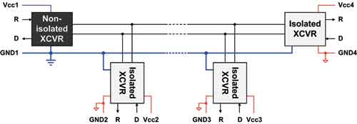 圖8顯示了兩個遠程收發器節點的詳細連接,而圖9則顯示了一個使用了多個收發器的隔離式數據傳輸系統的例子。除1個收發器以外,所有其他的收發器均通過隔離連接至總線。左側的非隔離收發器為整個總線提供了單接地參考。