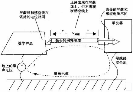 當(dāng)傳感線和屏蔽線都連接到工作電路的地時(shí),兩條線上的不同壓降會(huì)在示波器的垂直放大器上反映兩者的電壓差。我們無從知道這個(gè)電壓差是由探頭電纜遠(yuǎn)端的實(shí)際信號(hào)產(chǎn)生的,還是由屏蔽電流產(chǎn)生的。雖然我們希望示波器顯示無電壓,它可顯示的就是屏蔽電壓。