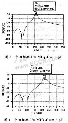 通常,電調諧濾波采用雙極點調諧濾波,諧振回路分為串聯諧振回路和并聯諧振回路,通過電感或電容進行耦合。此電調濾波器采用的是并聯諧振回路,用電感進行耦合。在進行仿真之前,需要建立仿真模型和設計各種參數。基于以上模型,利用ADS軟件對電調濾波器進行電路設計和仿真。由于系統要求對該電調濾波器進行AGC控制,所以在仿真時加入雙柵FET。傳輸函數S21、頻率范圍設在10~350 MHz、電容在2.6~39 pF之間變化,仿真使用的放大器是NE25118。最終的ADS模型仿真結果如下面兩組曲線所示。若LC濾波器不使用放大器,仿真結果中可以看出濾波器的插損在2~3 dB左右。