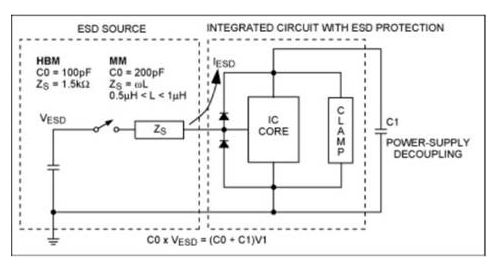 靜電放電強(qiáng)度以電壓形式表示,該電壓由電容的儲能電荷產(chǎn)生,最終傳遞到IC。作用到IC的電壓和電流強(qiáng)度與IC和ESD源之間的阻抗有關(guān)。對電荷來源進(jìn)行評估后建立了ESD測試模型。