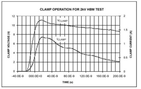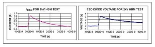 如果對IC引腳進(jìn)行 HBM測試,測試電路的初始電壓是2kV,通過ESD二極管的電流約為1.33A(圖2):