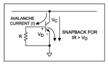 雙極型IC的箝位電路類似于在受保護(hù)核電路中提供一個受沖擊時擊穿的部件,圖3給出了圖1中箝位功能的詳細(xì)電路。箝位晶體管的過壓導(dǎo)致集電極-基極之間的雪崩電流,發(fā)射結(jié)的正向偏置會進(jìn)一步提高集電極電流,導(dǎo)致一個“突變”過程。箝位時的V-I特性曲線如圖4所示。