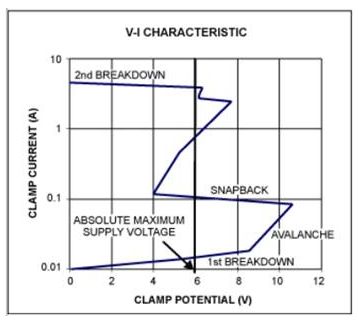 [page]箝位電壓從第一次擊穿變化到突變穩(wěn)定后的導(dǎo)通電壓,如圖5所示。為保證箝位時關(guān)閉正常的工作條件,設(shè)計的箝位電壓一般要略高于IC的絕對最大電壓。