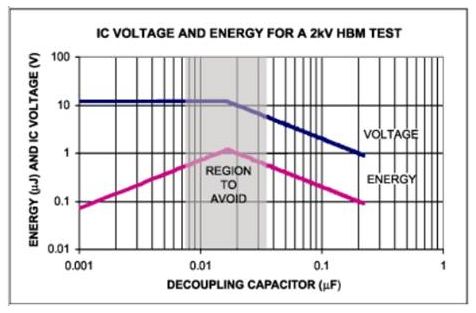 對于高速雙極型IC,HBM測試中吸收的最大能量是1μJ;2kV人體模式下,如果電容小于0.02μF(圖 6),C1>>C0二極管會產(chǎn)生動作。為了使去耦電容的能量低于1μJ,去耦電容有兩種選擇:要么容值大于0.05μF,要么小于 0.005μF。當(dāng)使用更高的測試電壓時,要按比例增大0.05μF電容的尺寸。