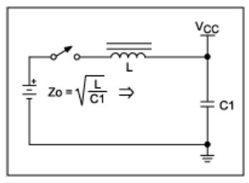 去耦電容與電源間的引線總是存在一定量的電感,通常也會接入一個濾波電感。這種配置下,最大浪涌電流取決于濾波電感與去耦電容的特征阻抗,這個阻抗(圖7 中的Zo)類似于MM測試中的電流限制。