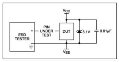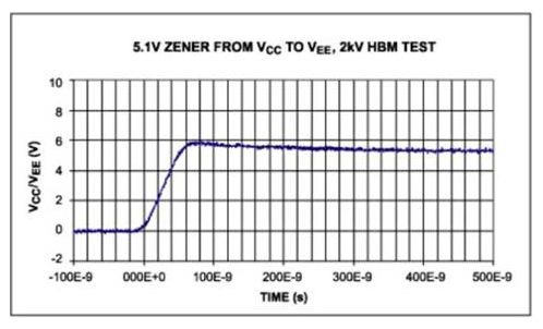 電源去耦電容會影響箝位操作,傳遞到去耦電容的電荷會產(chǎn)生高于IC絕對最大值的電壓,但還不足以使箝位電路導(dǎo)通。這時的電容相當(dāng)于一個能源,迅速向器件注入能量。