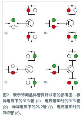 當一只正常晶體管插在測試端子之間時,它限制電流只能沿某些方向流動。串聯的LED表示出這些方向,因此指示出了晶體管的類型。例如,對NPN晶體管,LED發光為紅-綠-紅;而對PNP晶體管,發光為綠-紅-綠。