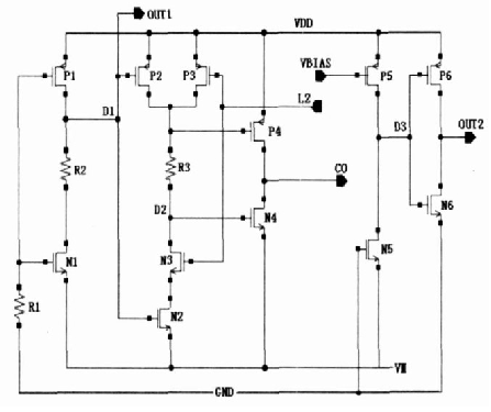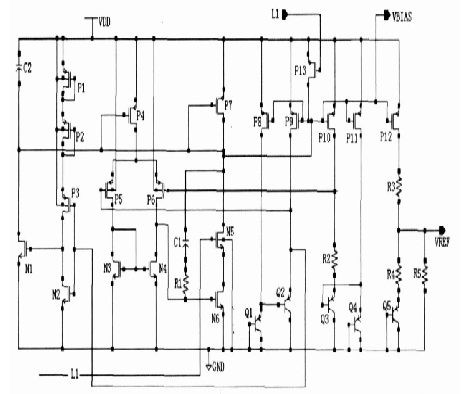圖1中N1,N2, P1, P2, P3, C1作為啟動電路,有源電阻P1, P2 起限流作用。N5, P13 為開關(guān)管,當(dāng)保護(hù)電路處于休眠狀態(tài)時(shí),電路必須停止工作,使功耗降為最低,此時(shí)通過內(nèi)部控制電路使L1 為低電位, P13 管打開,使偏置點(diǎn)VB IAS上升為高電位,P4, P7, P8, P9 , P10, P11, P12管截止,N5管關(guān)閉,切斷由P13,N6形成的支路,該電路停止工作,電流幾乎為零。經(jīng)仿真,該基準(zhǔn)電路在2. 2V電壓下可正常工作。