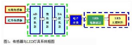 傳感器作為信號采集和機(jī)電轉(zhuǎn)換的器件,其機(jī)電技術(shù)都已相當(dāng)成熟,近幾年MEMS技術(shù)興起又將傳感器技術(shù)向小型化、智能化、多功能化、低成本化大踏步邁進(jìn)。光敏傳感器、紅外傳感器等各種類型的傳感器都可與LED照明燈具組成一個智能控制系統(tǒng),傳感器將采集來的各種物理量信號轉(zhuǎn)換成電信號,可以經(jīng)由集成電路化的AD轉(zhuǎn)換器、MCU、DA轉(zhuǎn)換器對所采集的信號進(jìn)行智能化處理,從而控制LED照明燈具開啟和關(guān)閉。人類可以籍此在MCU上設(shè)定各種控制要求,控制LED燈的開關(guān)時間、亮度、顯色、多彩變幻,從而達(dá)到省電節(jié)能的目標(biāo)。傳感器與LED燈具組成的系統(tǒng)框圖如圖1所示。目前的集成電路制造技術(shù)已經(jīng)可以將AD、DA、MCU集成在一個5X5mm或更小的封裝內(nèi),安裝在燈具內(nèi)既不占面積而且十分方便。