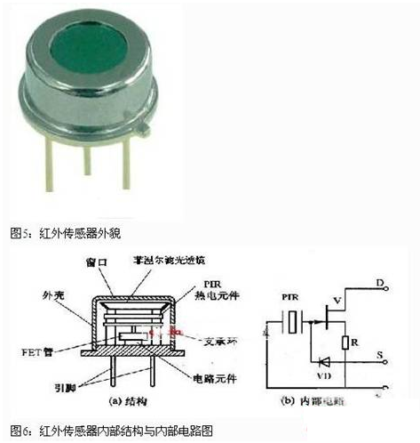 被動式紅外傳感器有三個關(guān)鍵性的元件:菲涅爾濾光透鏡,熱釋電紅外傳感器(PIR)和匹配低噪放大器。菲涅爾透鏡有兩個作用:一是聚焦作用,即將熱釋紅外信號折射在PIR上:二是將探測區(qū)內(nèi)分為若干個明區(qū)和暗區(qū),使進(jìn)入探測區(qū)的移動物體(人)能以溫度變化的形式在PIR上產(chǎn)生變化的熱釋紅外信號。一般還會匹配低噪放大器,當(dāng)探測器上的環(huán)境溫度上升,尤其是接近人體正常體溫(37℃)時,傳感器的靈敏度下降,經(jīng)由它對增益進(jìn)行補(bǔ)償,增加其靈敏度。輸出信號可用來驅(qū)動電子開關(guān),實(shí)現(xiàn)LED照明電路的開關(guān)控制。圖5是紅外傳感器外貌,圖6 是紅外傳感器內(nèi)部結(jié)構(gòu)與內(nèi)部電路圖。圖7 是帶紅外傳感器的LED照明燈具,這是一款E27標(biāo)準(zhǔn)螺口燈頭的燈具,它的電源適用范圍是 AC180V-250V (50/60Hz), 紅外傳感器檢測范圍大約在3M—15M,它的標(biāo)準(zhǔn)產(chǎn)品 IFS-Bulb 3W燈具達(dá)80 lm ,5W燈具達(dá)140 lm 。在LED光源模塊的中央部分嵌入紅外線傳感器。一旦紅外傳感器檢測到人的體溫,LED電燈泡將會在50秒內(nèi)自動開啟與關(guān)閉。適用于任何一種室內(nèi)應(yīng)用,如走廊、儲藏室、樓梯和大廳入口處。