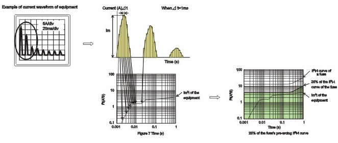 由于開關(guān)電源的出現(xiàn),使得線路中的浪涌電流變得復(fù)雜,多變,不同的浪涌電流或工作電流波形產(chǎn)生的能量是不同的,電路設(shè)計者要了解回路中出現(xiàn)的浪涌電流或工作電流的波形,以適當(dāng)?shù)剡x擇熔斷的工作電流。參照圖 (3)