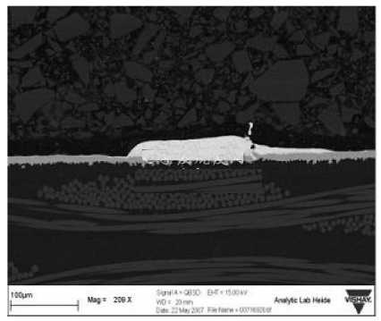 厚膜電阻的使用經驗表明,短時過載、焊接熱等熱應力和脈沖應力會使阻值發生漂移。這些在貼片式保險絲里發生的現象將會改變保險絲的特性,進而縮短熔斷時間。雖然熔體使用了幾種不同的材料,例如銅錫合金,可以達到高水平的I2T,但在持續的熱應力之后,熔體對斷開時間的縮短是非常敏感的。這是由于應力會導致熔體組成材料的遷移,如圖2所示,該圖顯示了在施加脈沖負載應力之后,銅錫合金正在發生遷移的情況。