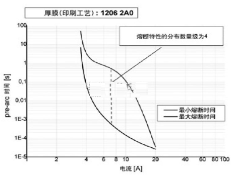 在設計階段,電子工程師會碰到熔斷特性大幅變化的情況。一般來說,貼片式保險絲是低阻值的電阻,其阻值只有幾歐姆。如上所述,熔融特性與電阻值有關。如果電阻值的變化范圍很大,熔融特性也就相應地有很大變化。由于這種可能發生的變化,貼片式保險絲在碰到正常的涌流時就斷開,或是相反,在過載情況下,應該斷開時卻不斷開,這種最糟糕的情形是工程師必須避免的。圖3所示為印刷厚膜保險絲的熔斷特性典型分布。