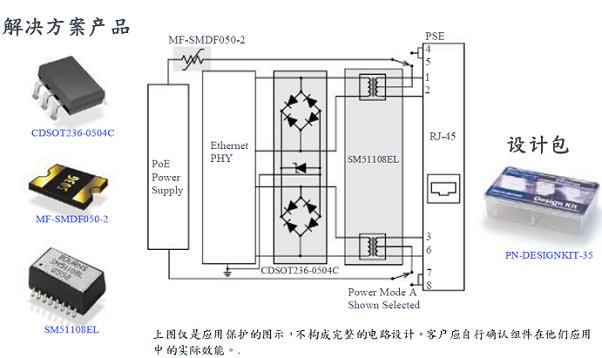 優(yōu)點(diǎn):本解決方案提供方案提供 ESD保護(hù)給10/100 Base-T以太網(wǎng)供電保護(hù)供電保護(hù)PD 組件,且不影響以太網(wǎng)路信號(hào)。