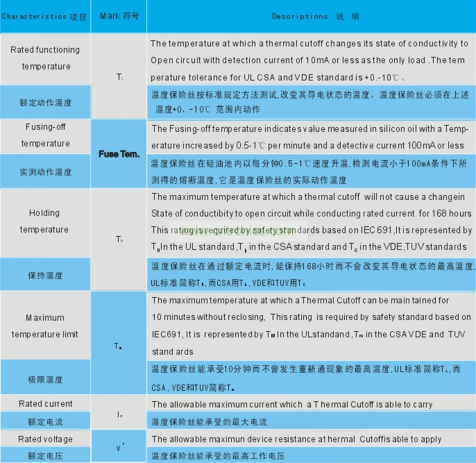 當溫度保險絲周圍溫度上升到它的動作溫度時,其易熔合金熔化并在表面張力作用下及特殊樹脂幫助作用下,收縮成球狀附兩引腳未端或保險絲內彈簧的彈力推走電極作用,這樣電路被切斷