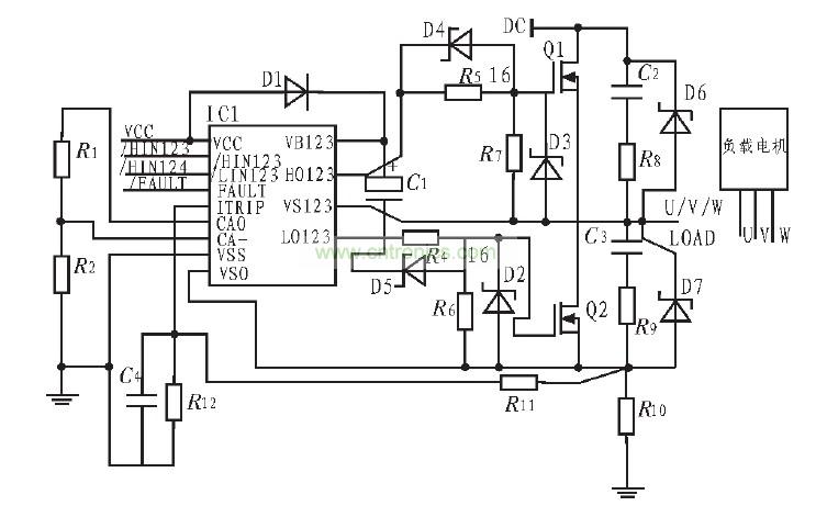 圖3是由IR2130組成的無刷直流電機驅動原理圖為便于表示只畫出其中一個橋臂的電路示意圖,通過IR2130輸入信號控制MOSFET的開關,由此驅動無刷直流動機。C1是自舉電容,為上橋臂功率管驅動的懸浮電源存儲能量,D1的作用是防止上橋臂導通時母線電壓倒流到IR2130的電源上而使器件損壞,因此D1應有足夠的反向耐壓,當然D1與C1串聯也是為了滿足主電路功率開關頻率的要求,D1應選快速恢復二極管。 R1、R2、R10、R11、R12、C4組成過流檢測電路。R5、R6為柵極驅動電阻,D4、D5為功率管提供了一個低阻抗的放電回路,使功率管能夠快速的泄放電荷。