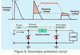汽車系統中保護電路的首要目標是高浪涌電壓,但是被鉗位的電壓仍然很高。因此在24V動力總成中二次保護特別重要,比如卡車和小貨車里的動力總成。主要原因是大多數穩壓器和DC-DC轉換器IC的輸入電壓是45V~60V。對于此類應用,建議使用使用圖9中的二次保護。