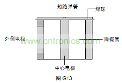 失效保護機構(gòu)是焊接在中心電極上帶塑料薄片的短路簧片。在正常的工作條件下,塑料薄片與兩個外側(cè)電極隔離,如圖G13。當長時間放電使氣體放電管溫度達到塑料薄片的熔點時,塑料薄片就會被軟化,促使短路彈片被激活,并與兩個外側(cè)電極搭接。這個過程導致三個電極之間永久短路,建立起一條低阻抗路徑,將故障電流引到地面,而不會產(chǎn)生顯著的熱量。