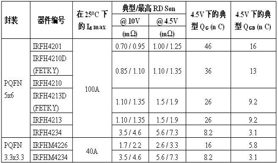 全新FastIRFET系列配備IR新一代硅技術,采用符合行業標準的PQFN封裝,為分立式DC-DC轉換器提供基準功率密度。該系列包括能夠提供低至0.7 mΩ導通電阻 (RDS(on)) 的IRFH4201,以及旨在降低鳴震和進一步提升系統效率的IRFH4210D和IRFH4213D單片式FETKY組件。